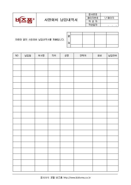 사원회비 납입 내역을 정리할 수 있는 내역서양식입니다. 납입일, 부서명, 직위, 성명, 연락처, 회비, 납입여부 등의 항목으로 구성되어 있으며 사원회비 납입 내역을 상세히 기입할 수 있도록 합니다.