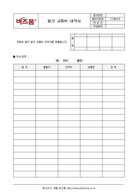 월간 교통비 내역을 정리할 수 있는 내역서양식입니다. 일자, 출발지, 도착지, 교통편, 금액 등의 항목으로 구성되어 있으며 월간 교통비 내역을 상세히 기입할 수 있도록 합니다.