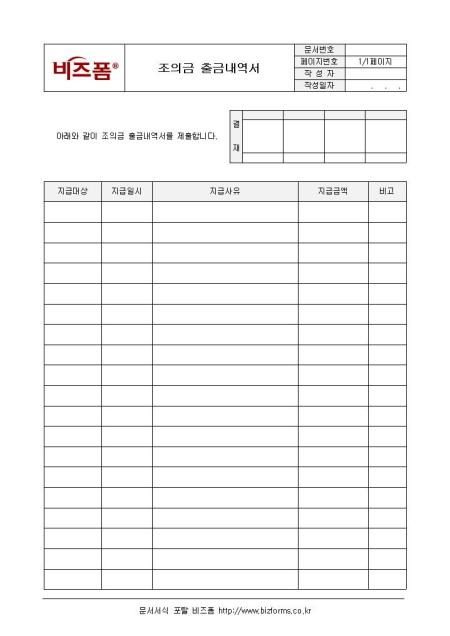 조의금 출금 내역을 정리할 수 있는 내역서양식입니다. 지급대상, 지급일시, 지급사유, 지급금액, 비고 등의 항목으로 구성되어 있습니다.