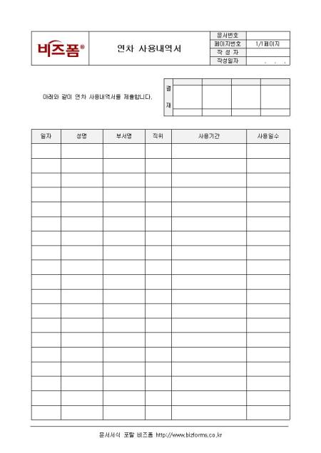 연차 사용 내역을 정리할 수 있는 내역서양식입니다. 일자, 성명, 부서명, 직위, 사용기간, 사용일수 등의 항목으로 구성되어 있습니다.
