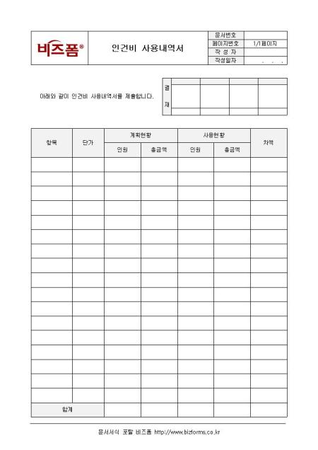 인건비 사용 내역을 정리할 수 있는 내역서양식입니다. 항목, 단가, 계획현황, 사용현황, 차액 등의 항목으로 구성되어 있습니다.