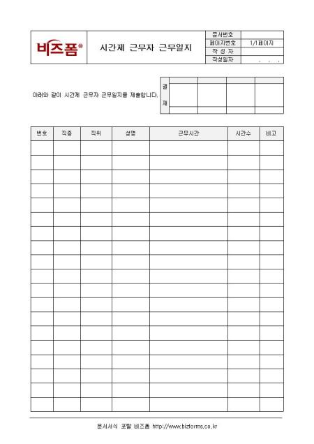 시간제 근무자를 관리할 수 있는 근무일지양식입니다. 번호, 직종, 직위, 성명, 근무시간, 시간수, 비고 등의 항목으로 구성되어 있습니다.