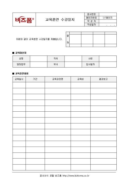 교육훈련 수강 내역을 정리할수 있는 일지양식입니다. 성명, 직위, 사번, 담당업무, 부서, 입사일자, 교육훈련내용 등의 항목으로 구성되어 있습니다.