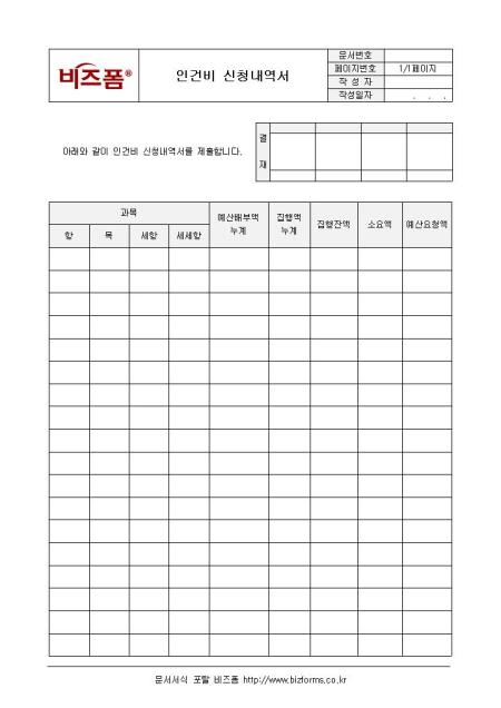 인건비 신청 내역을 관리할 수 있는 내역서양식입니다. 과목, 예산배부액 누계, 집행액 누계, 집행잔액, 소요액, 예산요청액 등의 항목으로 구성되어 있습니다.