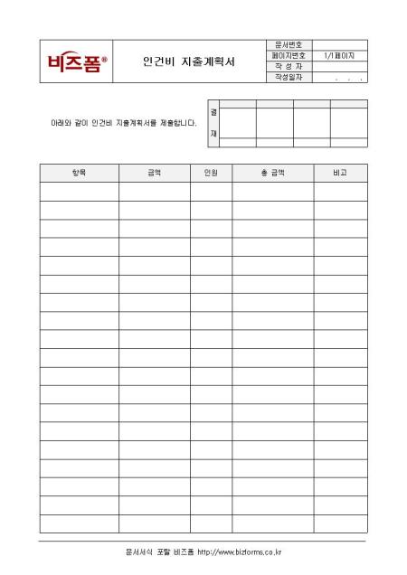 인건비 지출을 계획할 수 있는 계획서양식입니다. 항목, 금액, 인원, 총 금액, 비고 등의 항목으로 구성되어 있습니다.