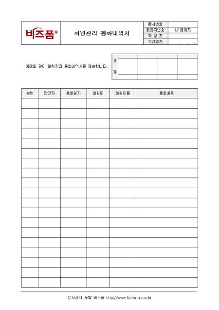 회원관리 통화 내역을 기록할 수 있는 내역서양식입니다. 순번, 담당자, 통화일자, 회원ID, 회원이름, 통화내용 등의 항목으로 구성되어 있습니다.