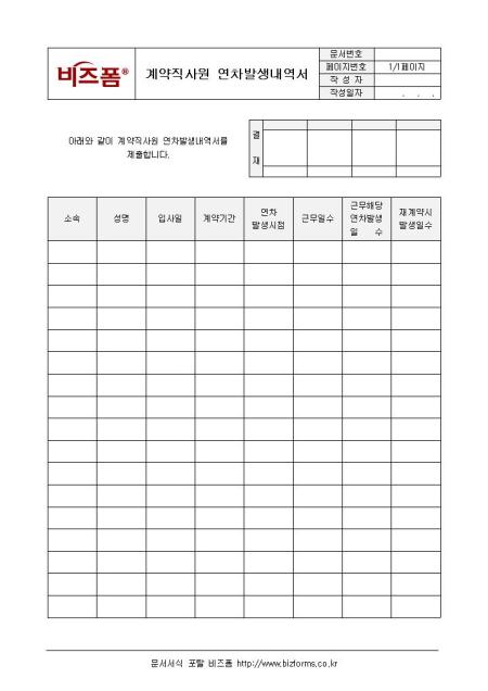 계약직사원 연차 내역을 기록할 수 있는 내역서양식입니다. 소속, 성명, 입사일, 계약기간, 연차발생시점, 근무일수, 근무해당 연차발생 일수, 재계약시 발생일수 등의 항목으로 구성되어 있습니다.