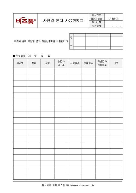 사원별 연차 사용현황을 확인할 수 있는 현황표양식입니다. 부서명, 직위, 성명, 총연차일수, 사용일수, 잔여일수, 특별연차사용일수, 비고 등의 항목으로 구성되어 있습니다.