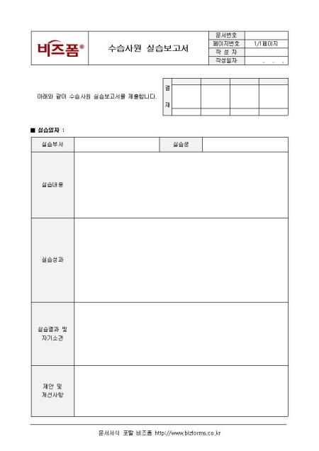 수습사원 실습 결과를 보고할 수 있는 보고서양식입니다. 실습부서, 실습생, 실습내용, 실습성과, 실습결과 및 자기소견 등의 항목으로 구성되어 있습니다.