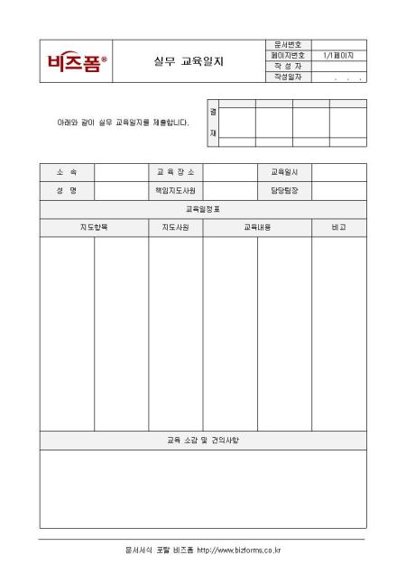실무 교육에 대한 일지0양식입니다. 소속, 교육장소, 교육일시, 성명, 책임지도사원, 담당팀장, 교육일정표, 교육 소감 및 건의사항 등의 항목으로 구성되어 있습니다.