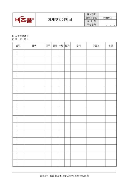 일정기간 사용되는 자재구입에 관한 계획서를 작성할때 사용되는 서식이다. 구성요소는 날짜, 품목, 규격, 수량등으로 구성되어 있으며 회사가 구입하는 자재의 구입처 및 구입단가는 업무부장이 결정하나 다음 각 호의 경우는 사장의 승인을 얻어 결정하여야 한다.