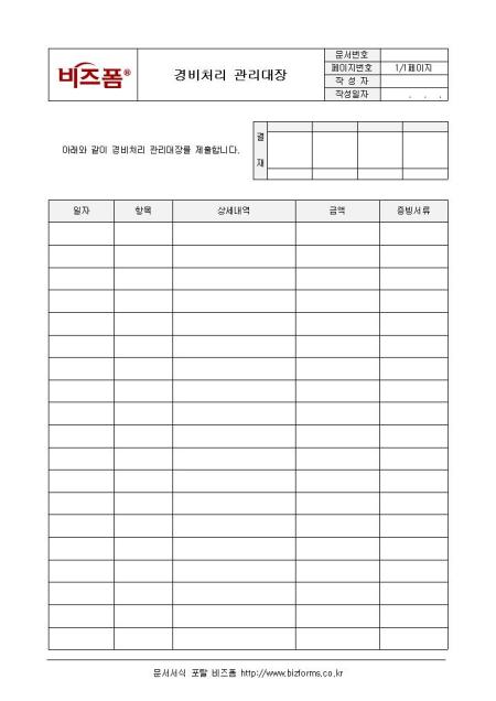 경비처리에 대한 관리대장양식입니다. 일자, 항목, 상세내역, 금액, 증빙서류 등의 항목으로 구성되어 있습니다.