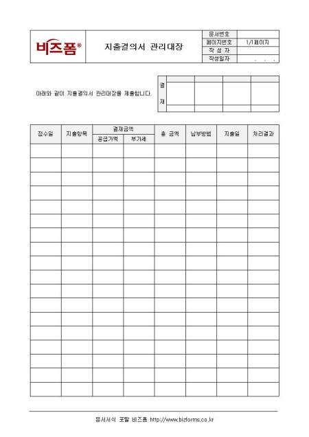 지출결의서에 대한 관리대장양식입니다. 접수일, 지출항목, 결재금액, 총 금액, 납부방법, 지출일, 처리결과 등의 항목으로 구성되어 있습니다.