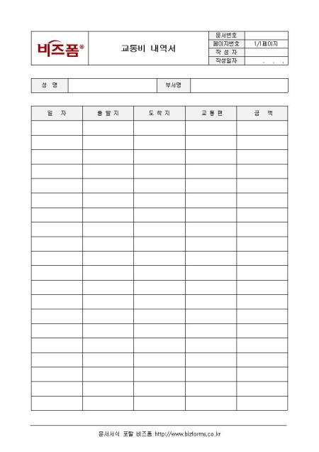 교통비 내역서입니다. 일자, 출발지, 도착지, 교통편, 금액으로 구성되어 있습니다.
