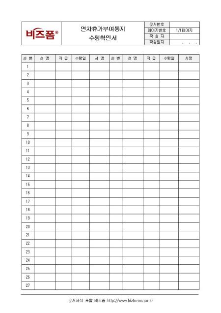 연차휴가부여통지 수령확인서 입니다. 순번, 성명, 직급, 수령일, 서명 등으로 구성되어 있습니다.