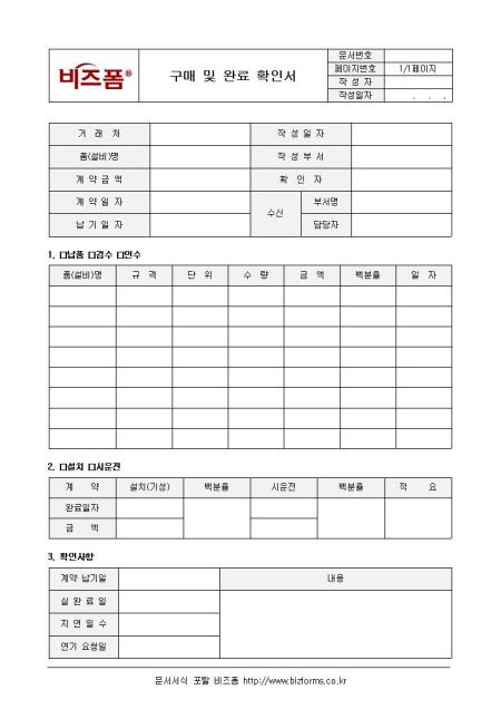 구매 및 완료 확인서입니다. 거래처, 품명, 계약금액, 계약일자, 납기일자, 금액, 백분율 등으로 구성되어 있습니다.