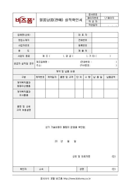 물품납품(판매) 실적확인서입니다. 업체명, 영업소재지, 사업자 번호, 용도, 품명 및 규격, 단위 등으로 구성되어 있습니다.