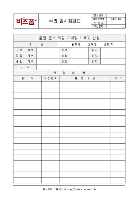 수입 검사점검표입니다. 구분, 작성, 직책, 성명, 검토, 승인 등으로 구성되어 있습니다.