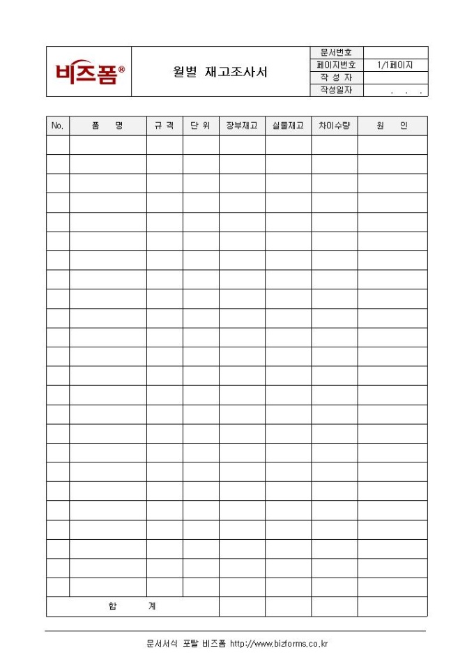 9,000원/월월별 재고조사서입니다. 품명, 규격, 단위, 장부재고, 실물재고, 차이수량 등으로 구성되어 있습니다.