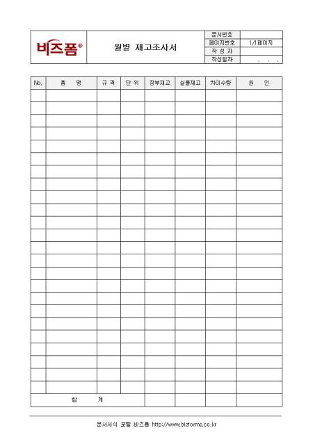 월별 재고조사서입니다. 품명, 규격, 단위, 장부재고, 실물재고, 차이수량 등으로 구성되어 있습니다.