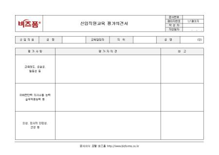 신입직원교육 평가의견서입니다. 신입직원, 성명, 교육담당자, 직위, 평가사항, 평가자 의견 등으로 구성되어 있습니다.