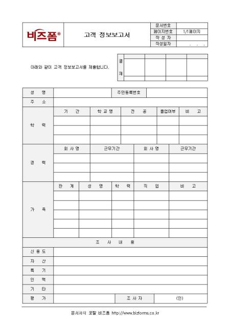 고객 정보보고서입니다. 성명, 주소, 학력, 기간, 학교명, 전공, 졸업여부 등으로 구성되어 있습니다.