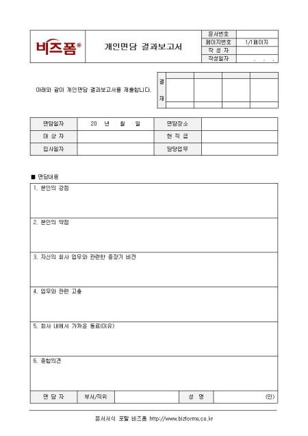 개인면담 결과보고서입니다. 면담일자, 면담장소, 대상자, 현직급, 입사일자 등으로 구성되어 있습니다.