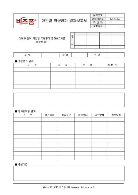 개인별 역량평가 결과보고서입니다. 소속, 셩명, 직군, 종합평가 결과, 구분, 점수 등으로 구성되어 있습니다.