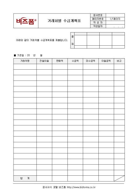 거래처별 수금계획표입니다. 기준일, 거래처명, 전월이원, 판매액, 수금액 등으로 구성되어 있습니다.