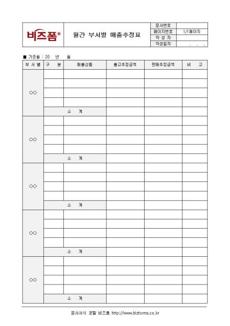 월간 부서별 매출추정표입니다. 부서별, 구분, 매출상품, 출고추정금액, 소계 등으로 구성되어 있습니다.