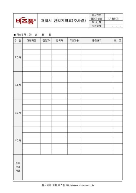 거래처 관리계획표(주차별)입니다. 구분, 거래처명, 담당자, 연락처, 주요제품으로 구성되어 있습니다.
