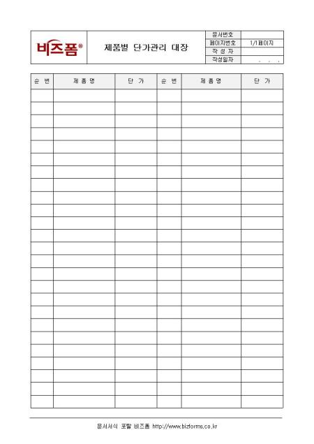 제품별 단가관리 대장입니다. 순번, 제품명, 단가 등으로 구성되어 있습니다.