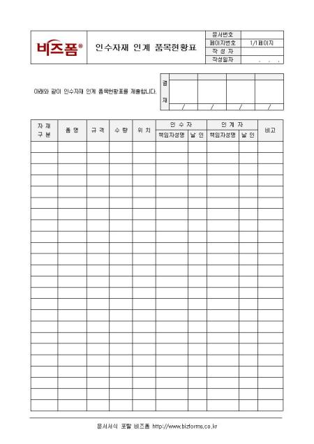 인수자재 인계 품목현황표입니다. 자재구분, 품명, 규격, 수량, 위치, 인수자 등으로 구성되어 있습니다.