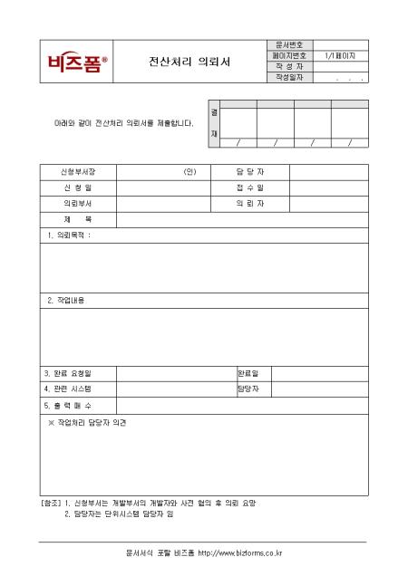 새로운 전산처리 프로그램을 의뢰할때 사용되는 서식이다. 구성요소는 의뢰부서, 의뢰제목, 작업내용으로 구성되어 있으며 해당부서에서 필요한 전산처리를 의뢰할때에는 의뢰서를 작성하여 전산실로 제출하여야 한다.