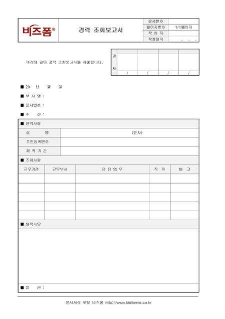 경력 조회보고서입니다. 인적사항, 성명, 주민등록번호, 재직기간, 조회사항, 근무기간 등으로 구성되어 있습니다.