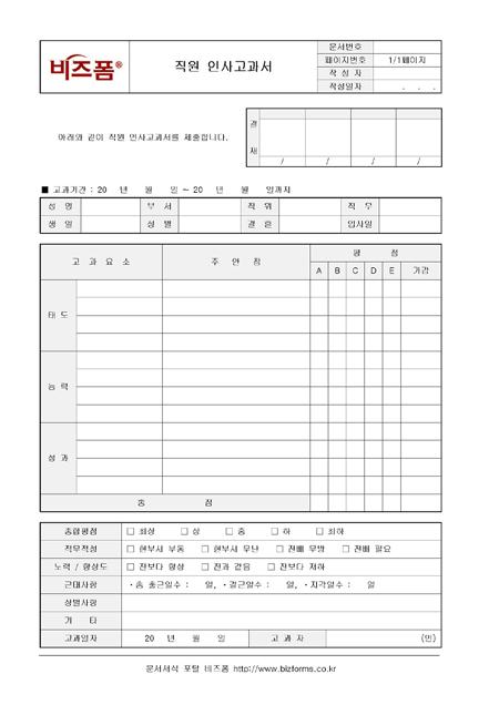 직원 인사고과서입니다. 성명, 부서, 직위, 직무, 생일, 성별, 결혼, 입사일, 고과요소 등으로 구성되어 있습니다.