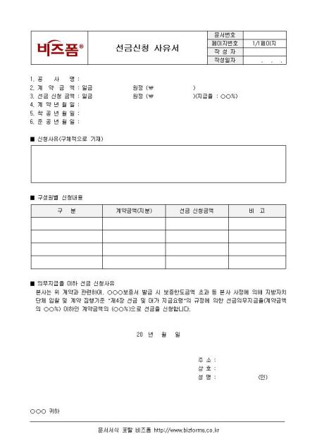 선금신청 사유서입니다. 공사명, 계약금액, 선금 신청 금액, 신청사유, 구성원별 신청내용 등으로 구성되어 있습니다.