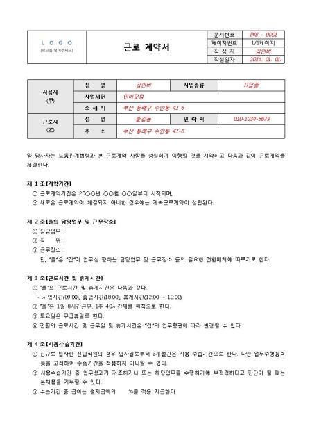 문서번호 / 페이지번호 / 작성자 / 작성일자를 입력, ISO 형태의 문서 표준화가 가능합니다. 여백, 자간, 글꼴 등을 정립 표준화 했습니다. 회사의 로고를 삽입할 수 있습니다. 회사명이나 주소를 입력해 일관성을 줍니다. 표준 결제란으로 업무의 효율성을 높일 수 있습니다. 문서번호 / 페이지번호 / 작성자 / 작성일자를 입력, ISO 형태의 문서 표준화가 가능합니다. 여백, 자간, 글꼴 등을 정립 표준화 했습니다. 회사의 로고를 삽입할 수 있습니다. 회사명이나 주소를 입력해 일관성을 줍니다. 표준 결제란으로 업무의 효율성을 높일 수 있습니다.