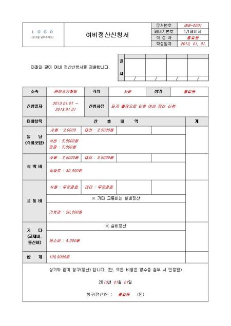 표준 여비 정산신청서(출장 및 여비 규정)