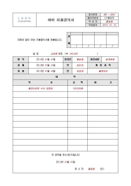 표준 여비 지출결의서(출장 및 여비 규정)