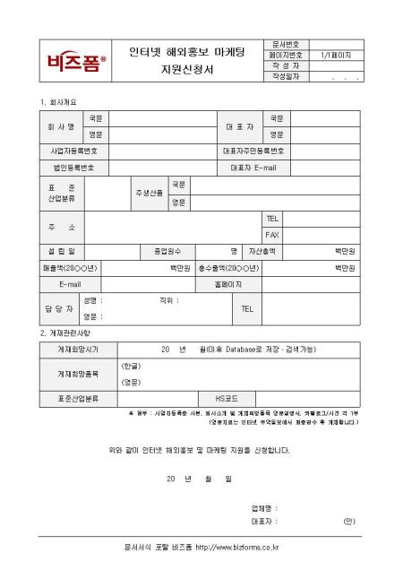 인터넷 해외홍보 마케팅 지원신청서입니다. 대표자, 주생산품, 종업원수, 홈페이지, 직위 성명, 등으로 구성되어 있습니다.