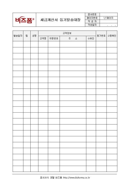 세금계산서 등기발송대장입니다. 발송일자, 팀, 성명, 고객정보, 등기번호, 수령확인 등의 항목으로 구성되어 있습니다.