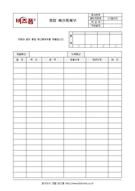 통합 예산통제부입니다. 일자, 부서, 금액, 당월누계, 당년누계 등의 항목으로 구성되어 있습니다.