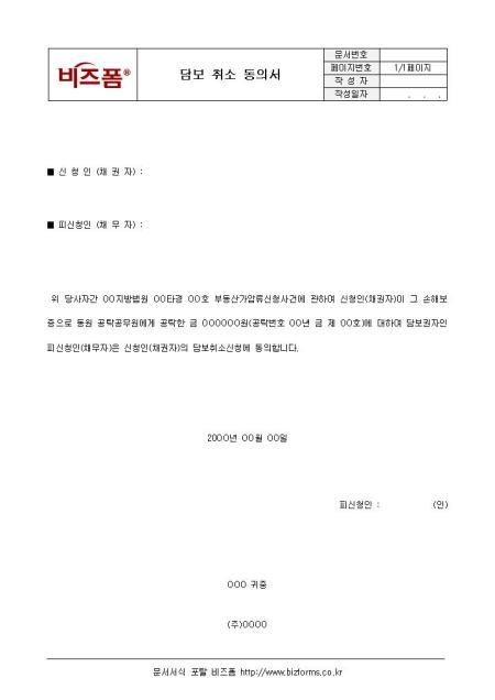 담보 취소 동의서입니다. 신청인(채권자),피신청인(채무자) 등의 항목으로 구성되어 있습니다.