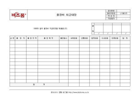 출장비 지급대장입니다. 순번, 출장자, 출장지역, 출장목적, 출상일수 등으로 구성되어 있습니다.