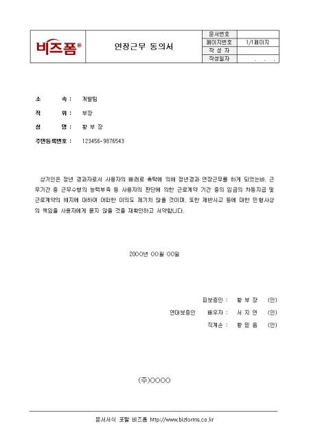 연장근무 동의서입니다. 소속, 직위, 성명, 주민등록번호 등으로 구성되어 있습니다.