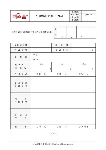 도매업체 현황 조사서입니다. 도매업체명, 대표자, 취급품목, 종업원수, 소재지, 최근 3년 매출액, 자격조건, 주거래처 납품실적, 제품 조달능력 등으로 구성되어 있습니다.