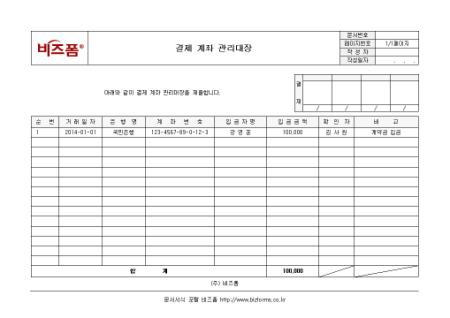 결제 계좌 관리대장입니다. 순번, 거래일자, 은행명, 계좌번호, 입금자명, 입금금액, 확인자, 비고 등으로 구성되어 있습니다.