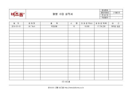 월별 수입 실적서입니다. 일자, 업체명, 품목, 수량, 외화금액, 원화금액, 비고 등으로 구성되어 있습니다.
