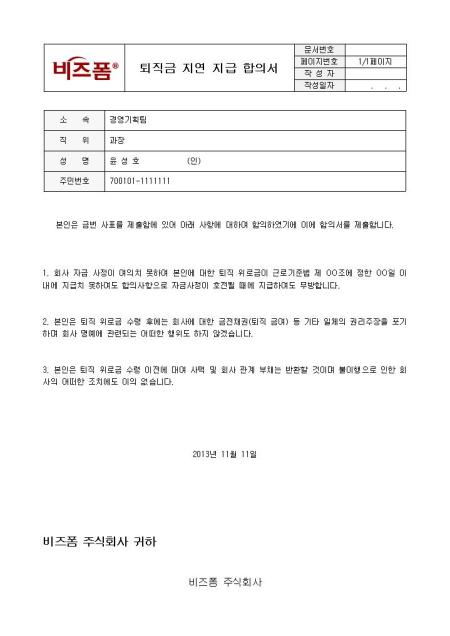 퇴직금 분할 지급 동의서입니다. 소속, 직위, 성명, 주민번호, 내용 등으로 구성되어 있습니다.